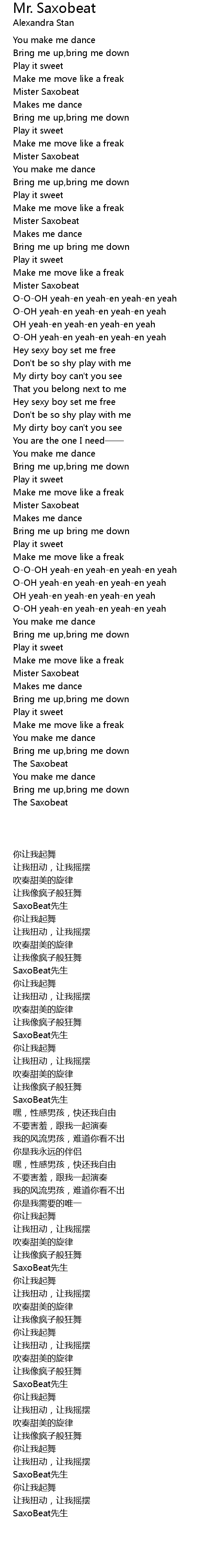 Subscribe (🔔) to the official Famous Music channel for new music, updates and behind the scenes footage click here, - Famous Music gives you lyric videos to the hottest songs in Pop, Rock, and EDM. Dance and sing along with your favorite tracks from Clean Bandit, Weezer, Broods, Janelle Monáe, Galantis, Lizzo , Rap and More! Lyrics:- You make me dance, bring me up, bring me down Play it sweet, make me move like a freak, Mr. Saxobeat Makes me dance, brings me up, brings me down Plays it sweet, makes me move like a freak, (Mr. Saxo-) Mr. Saxo- You make me dance, bring me up, bring me down Play it sweet, make me move like a freak, Mr. Saxobeat Makes me dance, brings me up, brings me down Plays it sweet, makes me move like a freak, Mr. Saxobeat Post-Chorus Oh-oh-oh-oh, girl, mm yeah, mm yeah, mm-mm yeah Oh-oh, girl, mm yeah, mm yeah, mm-mm yeah Oh, girl, mm yeah, mm yeah, mm-mm yeah Oh-oh, girl, mm yeah, mm yeah, mm-mm yeah Mr. Saxobeat Mr. Saxobeat Verse 1 Hey sexy boy, set me free Don't be so shy, play with me My dirty boy, can't you see That you belong next to me? Hey sexy boy, set me free Don't be so shy, play with me (You are the, you are the) My dirty boy, can't you see? (You are the, you are the) You are the one I need Chorus You make me dance, bring me up, bring me down Play it sweet, make me move like a freak, Mr. Saxobeat Makes me dance, brings me up, brings me down Plays it sweet, makes me move like a freak Post-Chorus Oh-oh-oh-oh, girl, mm yeah, mm yeah, mm-mm yeah Oh-oh, girl, mm yeah, mm yeah, mm-mm yeah Oh, girl, mm yeah, mm yeah, mm-mm yeah Oh-oh, girl, mm yeah, mm yeah, mm-mm yeah Mm yeah... Chorus You make me dance, bring me up, bring me down Play it sweet, make me move like a freak, Mr. Saxobeat Makes me dance, brings me up, brings me down Plays it sweet, makes me move like a freak Outro You make me dance, bring me up, bring me down Mr. Saxobeat You make me dance, bring me up, bring me down Mr. Saxobeat