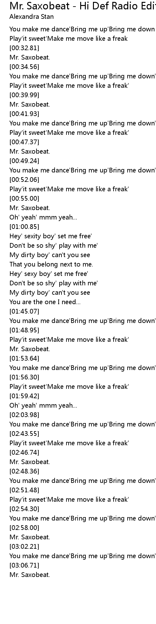 Alexandra Stan -- Mr Saxobeat. Includes on screen lyrics. PLEASE SUBSCRIBE to RamseysEntertainment for more lyric videos to . Mr Saxobeat Lyrics are a subject that is being searched for and favored by netizens now. You can Get the Mr Saxobeat Lyrics here. Download all royalty-free pics. Alexandra Stan - Mr. Saxobeat (Lyrics Video), Lyrics Video of Mr. Saxobeat (Radio Edition) by Alexandra Stan! LYRICS ON SCREEN! Subscribe for more please! I don't own .